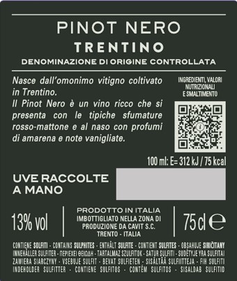 Pinot Noir has found an ideal terroir on the hillsides in Trentino and its grapes are carefully selected during harvest before being vinified. The cold maceration lasts 7/8 days in order to extract all the pronounced flavours such as red fruits with a black cherry. The alcoholic fermentation happens in stainless steel vats, while the aging. which lasts at least 10 months, is done in French oak barriques and oak casks to provide a velvety sensation on the palate.